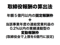 4年前に開催されました第67期の定時株主総会において、「取締役の報酬は年額5億円以内の固定報酬枠と、当該事業年度の連結営業利益の0.2%以内の業績連動型の変動報酬枠」とすることを決議いただきました。この変動報酬枠については、取締役会で6億円の上限を設定しています。
