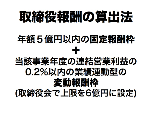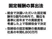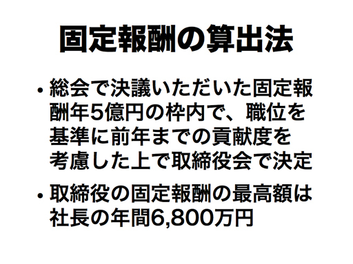 固定報酬については、総会で決議いただいた年5億円の枠内で基本的には職位、すなわち責任の重さに、前年までの貢献度を考慮して取締役会で決めております。第71期には取締役の固定報酬の総額は4億100万円でした。社長の固定報酬は年間6,800万円で、これが全取締役の最高額となっています。これを12等分して、役員報酬として、私どもは毎月いただいています。