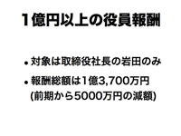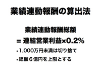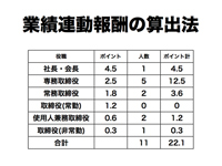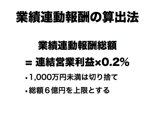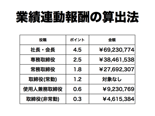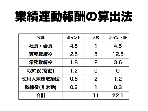 変動報酬については、業績連動型となり連結営業利益の0.2%を基準に総額を決めています。この総額は、1,000万円未満を切り捨てにし、また、総額6億円を上限とすることを取締役会で決めています。当期の連結営業利益は1,710億円でしたので、この0.2%の1,000万円未満を切り捨てますと、3億4,000万円となります。前期は、業績連動報酬の総額は上限の6億円になっていましたが、今期は2億6,000万円の減額をしたということになります。このように決められた変動報酬の業績連動報酬を取締役間でどのように配分するのかという算出方法については、取締役の職位別にポイントを決めております。業績連動報酬総額を、この職位別のポイントによって配分するというのが、業績連動報酬の決定の仕組みです。取締役11名全員のポイントを合計いたしますと、ご覧のように22.1になりますので、岩田は業績連動報酬総額の22.1分の4.5の配分をいただくということになります。これを金額に換算しますと、総額3億4,000万円の職位別一覧は、このようになります。この前年度の業績連動報酬を、役員賞与として、この株主総会終了後に私どもはいただく、ということになります。
