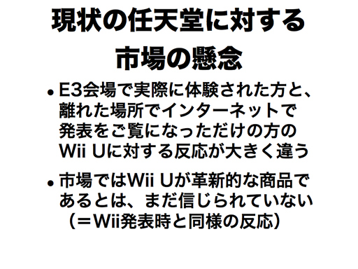 また、現地の方々は非常にポジティブなことをおっしゃっていて、業界関係者の方々の中でも「これは非常に新しい可能性のあるプラットフォームなので、自分たちも積極的にソフトを作りたい」と、多くの方が言っていただいている、いわば、E3の会場の中ではとても評判が良いのに、それが遠く離れた場所にうまく伝わりませんでした。この、うまく伝えられなかったというのは、私たちの非常に大きな反省点で、これは、(Wii U自体に)価値がないのであれば、価値のあるものを作り直さないと始まらないのですが、目の前で触っていただいた方に価値を認めていただけたので、「その価値をいかにお伝えしていくか」、そして、「その期待に応えられるような結果を出すようにできるか」がポイントになると思います。
