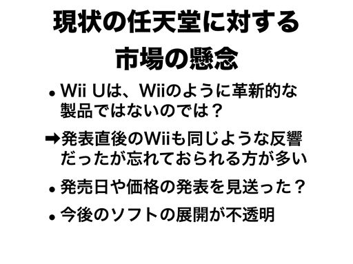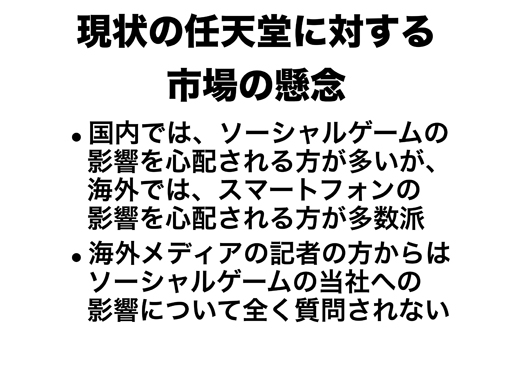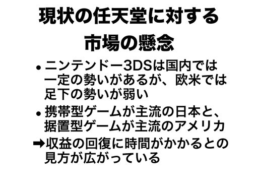 岩田: まず、何よりも昨今の株価の水準に対して、株主のみなさまに多大なご心配をお掛けしており、ここにおられる皆様が大変不本意な思いで今日ここにいらしているということについて、大変残念に思っていますし、また、会社がご期待に応えていないということに対して、私は会社を代表して本当に申し訳なく思っています。 株価というものは、会社の業績を基礎的な条件として、基本的には市場の皆様のご評価で決まるものです。「株価が下がったということは会社の資産も減った」という表現がありましたが、会社の資産が減っているかどうかとは別の問題で、会社がこれからどれぐらい利益を生み出していけるのかということに対して投資をされているみなさんが不安に思っておられるということだと思います。特に、第72期の業績は先ほどご報告いたしました通り、1962年の上場以来、初の最終赤字ですし、第73期に業績回復を見込んでいますけれども、任天堂は営業利益年1000億円以上をコンスタントに出してきた会社ですから、そういう水準と比べますと、まだまだ任天堂らしい利益水準に至らないとか、また投資家の方によっては、今の会社目標(業績予想)でさえ難しいのではないかと考えられているので、株価が昨今のような状態なのだと思います。現状の任天堂に対して株式市場がどのような懸念を持っていると私が見ているかということは、みなさん共通の関心事だと思いますので、少し時間をいただいてくわしくお話ししたいと思います。 まず、ポイントとして、ニンテンドー3DSは国内では一定の勢いがありますけれども、アメリカやヨーロッパでは足下の勢いが弱いということがあります。さらに具体的に申しあげますと、ニンテンドー3DSの国内での販売状況は順調で、むしろ期初の予想を上回るペースで販売できていると申しあげてもよいぐらいです。年明け以降、週間販売数の平均は8万3000台ぐらいで、これは、日本で売れている全部のゲームハードの約55%がニンテンドー3DSだということですから、今や昨年末にニンテンドー3DSの勢いがついてからは、日本のゲーム市場というのはニンテンドー3DSを中心に回っているとも言えます。すなわち、ここは私たちが当初目指していたシナリオ通りであり、順調なわけです。その一方で、本来日本に比べて人口も多く市場も大きいアメリカやヨーロッパの市場では、日本よりもずっと売れていないといけないんですが、昨年末に販売の勢いは、一度日本と同じようになったものの、年明け以降に販売ペースが落ちてしまいまして、今では全ハードの販売の中でニンテンドー3DSの占める割合は約2割ぐらいということで、本格的な勢いは出せておりません。このことを見ておられる投資家の方々は、「これは会社が言うように今期の業績が回復しないのではないか」、あるいは、「収益回復には会社が見通しを立てているよりももっと時間がかかるんじゃないかと」考えておられるかもしれません。先ほどお話をしましたニンテンドー3DS LLもそうですし、『Newスーパーマリオブラザーズ2』などの有力タイトルもそうですが、これらが夏に世界で発売されていきますので、このような懸念を早期に払拭できるような勢いをつけることが当面の最優先の課題の一つでございます。 ちなみに、任天堂にとってニンテンドー3DSでのアピールが難しいことの一つに、携帯型ゲーム機が主流になっている日本のゲーム市場と、据置型ゲーム機が主流になっているアメリカの市場の違いということがあります。このグラフを見ていただきたいんですが、上が日本で下がアメリカです。すべてのお客様、これはゲームを遊ばれる方も遊ばれない方もすべてに対して「この1年間ゲームを遊びましたか」「どんなゲーム機を持っていてどんなふうに遊んでいますか」というのを定期的に調べているんですが、その調査の中で、過去1年間ゲームを遊ばれた方に聞いた、「あなたにとって最も魅力的なゲーム機は何ですか」という割合のグラフなんです。左側の水色がWii。その次のグレーがPlayStation 3、これはソニーさんですね。次の緑色がマイクロソフトさんのXbox360。そして、赤色がニンテンドー3DS。ピンク色がニンテンドーDS。そして青がソニーさんのPlayStation Vita。薄いグレーがPlayStation Portable。そして、いわゆる携帯電話で遊ぶゲーム、スマートフォンで遊ぶゲーム、そしてパソコンのソーシャルネットワークで遊ぶゲーム。これは、今ゲーム機は単に任天堂とマイクロソフトさんとソニーさんだけの競争ではないと言われるようになりましたので、あえてこういうことを聞いております。これを見ていただきますと、下のアメリカでは、3つの据置型と呼ばれてきた、いわゆるテレビゲーム機が圧倒的なんですね。だから、アメリカではゲームといえばテレビゲーム機なわけです。ところが、日本ではゲームといえばテレビゲームと答える方は半分程度で、その分、携帯性のあるゲーム機に魅