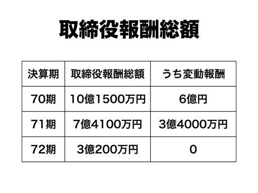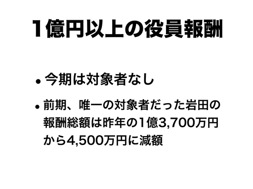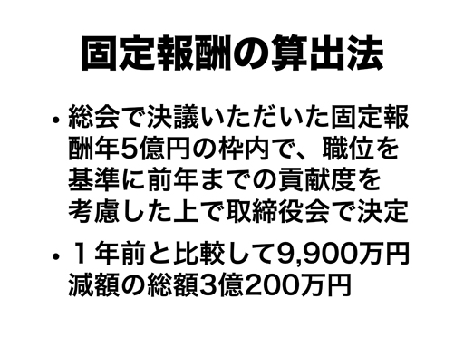 岩田: まず取締役報酬について、部分的に誤解もございますのでご説明をさせていただきたいと思います。ここにございますのが、取締役の報酬の総額です。72期がこの直近の決算期でございます。71期が1年前、70期がそのまた1年前ということで、70期のときには大変業績も良かったので、当然そのときに変動報酬が大きくございましたので、取締役報酬総額は大きくなっておりました。第72期の取締役の報酬総額は、3億200万円で、71期の7億4100万円から4億3900万円減額をいたしました。減額の主な理由ですが、通期の営業利益が赤字でしたので、業績連動分の変動報酬、これがいわゆる定義するところの役員賞与ですので、われわれはこの6月末には役員賞与を一切いただきません。先ほど賞与を3億も取るのかというご指摘でしたので、それは誤解であるということは申しあげておきます。もちろん、賞与をとっていないからこの業績でも良いのだと申しあげるつもりではございません。われわれはこの状況でしっかり会社をあるべき方向に導いて、来年業績をご報告するときに、「このように回復いたしました」と言えるように努力をしてまいります。また、固定報酬分というのがございまして、これは昨年の7月末の第1四半期決算発表のときに任天堂3DSの大幅な値下げを発表いたしましたときに、業績予想の大幅な下方修正になりましたので、「固定報酬分についても社長は50%、他の代表取締役は30%、その他の取締役は20%、報酬をカットします」と申しあげました。取締役報酬の任天堂の考え方ですが、67期の定時株主総会において、取締役の報酬は年間5億円以内の固定報酬枠と、当該事業年度の連結営業利益の0.2%以内の業績変動型の変動報酬枠とすることをこの総会の場で決議いただき、この変動報酬は営業利益に連動いたしますので、先ほど申しあげました通り、前期は算出上ゼロでございます。固定報酬につきましては、総会で決議いただいた5億円の枠内で基本的には職位、すなわち責任の重さに前年までの貢献度を考慮して取締役会で決定しております。前期は、取締役の固定報酬も削減をいたしましたので、1年前と比較すると9,900万円減額の3億200万円でございました。ちなみに、4月から3月までの年度のうち、固定報酬の削減は8月から行いました。ですから、12か月のうち8か月が対象になりました。現状の経営環境を鑑みまして、今期も報酬カットは継続することにいたしましたので、この4月からの年度では通年が削減対象となりますので、固定報酬はさらに削減となる見通しであることもあわせてご説明いたします。また、去年は1億円以上の役員報酬の者はいるかというご質問をいただいておりましたので、念のため一緒に申しあげておきますが、今1億円以上の報酬を受け取っている役員はおりません。昨年唯一の対象者であった私岩田は、今期(2012年3月期)の報酬総額は4500万円となっておりました。また、当社では65期の定時株主総会終結時に退職慰労金はすでに廃止しておりますし、ストックオプションなどの現金以外の役員報酬もございませんのでこれがすべてでございます。 また、先ほどお話がございました、「こんなときに従業員にボーナスを出すのか」ということでございますが、一方で従業員には従業員の生活もございますし、また、従業員の賞与というのは、かつて非常に業績が良くて、株主のみなさまにたくさん配当をお支払いできたときも、劇的に賞与を上げるということはしておりません。ゲームビジネスというのは、作って世の中に問うて初めて分かる浮き沈みというものがございます。浮き沈みがある以上、その浮き沈みに極端な影響を受けた待遇で安心して働けないとなれば、今度は世の中の常識とはずれるような新しい、のちに認められた後は革新的だったと言われるようなものは、たいてい最初は正気かといったご指摘を受けたりすることが多いですから、そういうものをしっかり作るためには、目先の業績のことに過剰には影響を受けずにした方が良いという判断で、かつて業績好調のときも極端に上げることはしておりませんし、逆に下降局面だからすぐに下げるのだということでもありません。ただ、さすがにこれだけ厳しい、通期赤字ですから、今までと同じことが既得権ということはないだろうと、それなりの削減はいたしました。ですから、身内に甘くお手盛りをしているという意識はございませんので、どうかご理解いただければと思います。 |