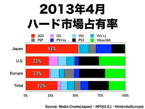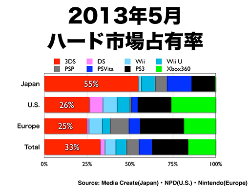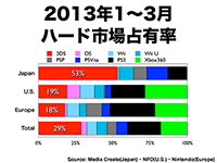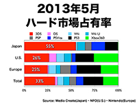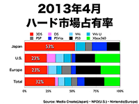 岩田: まず、世界のゲーム市場は、やはり日本、アメリカ、ヨーロッパが中心ですので、まずこれらの地域がどのような状況かというお話を少しさせていただこうと思います。これは、今年の1月から3月のハードの市場占有率です。一番上のグラフが日本、次がアメリカ、ヨーロッパで、一番下は日本、アメリカ、ヨーロッパを合計したものです。そして、この赤い部分がニンテンドー3DSのマーケットシェアです。それから、ピンク色がニンテンドーDS、薄いブルーがWii、濃いブルーがWii U。それから、ソニーさんのPSP、PS Vita、そしてPS3、Xboxと、これらがハード市場でシェアを分け合っている構造になっています。ご覧いただくとお分かりのとおり、日本でのニンテンドー3DSは非常に大きな存在感があるのに、アメリカやヨーロッパでは今一つです。その結果、世界全体でも(シェアが)30%を切っているという状態です。これが1月から3月までの状況でしたが、実は3月の後半から、ニンテンドー3DSの有力ソフトを次々とアメリカやヨーロッパ向けに発売しました。これによって、4月にはこう変わり、5月にはこうなって、多くのゲーム機が世代交代で販売数を減らしていく中、ニンテンドー3DSは前年並みあるいは前年以上に売れるという状況を作ることができました。まずはこうした足固めをしっかりするのが、今期の業績を考える上では非常に重要だと思っています。 また、経営陣に関しては、年齢や性別等ではなく、これから1年間の任天堂の舵取りをする上で最善の体制として取締役候補者を推薦しております。今年はちょうど世代交代の時期にあたり、年齢が高い4人の取締役が退任をして、若い人間が入ってまいりますので、平均年齢でいうと7歳弱ほどの若返りになります。それから、女性については、任天堂の中には女性の幹部社員もたくさんおりますし、女性の意見は商品開発にもいろいろな形で取り入れられています。先ほど例に挙げました『とびだせ どうぶつの森』は女性の開発者が非常に多くかかわっている代表的なタイトルであり、その商品はやはり女性のお客様にたくさん受け入れられているということがございます。その意味で、われわれは女性の視点を十分に活かして開発しているからそういうことができていると思います。「(経営陣の中に)女性がいないから問題があって、女性がいるから問題がない」というのではなくて、女性の視点と意見をきちんと反映して会社が運営できているかどうかだと思っておりますので、その旨はご了解ください。 それから、英語教育の可能性についてですが、ゲーム機の一つの特徴として、何かをすると反応がすぐ返ってくる、ということがあります。人間というのは、何かをしても反応が返ってこないものを続けることは難しく、例えば英語の勉強を1日すればたちどころにしゃべれるようになるのであれば、きっと日本中、英語をしゃべれる人だらけになるわけですが、自分が努力したことに対して、すぐに上達するなどの反応がないのが現実で、これが、英語の勉強を続けられない大きな要因だという観点で考えますと、ゲーム機の技術を使ってできることというのはあると思います。一方で、ニンテンドーDSを出したばかりの頃と比べますと、今はスマートフォンやタブレットのような別の手段もあって、ゲーム機でしか提供できないものではなくなってきている面もあるので、それらのことも考慮しながら、「任天堂が娯楽と教育を兼ね備えた楽しみながら勉強できるものは何か」ということについては、引き続き考えていきたいと思います。ありがとうございました。 |