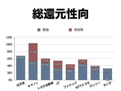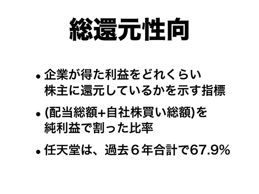岩田: まず、株式分割というのは以前から株主総会の場でたびたび話題になっております。以前、株券が電子化される前は、「分割するだけで非常に事務コストが発生するので、株券が電子化された後に考えたい」ということを申しあげてきましたが、すでに株券は電子化されましたので、今は事務コストは考える必要がございません。そのため、当然、分割をするならどういう方法があり、どういうメリットとデメリットがあるのかということを会社の中で研究しておりますが、現時点で具体的に申しあげられることはございません。ただ、株式分割には2つの側面があるということだけはご理解いただきたいと思います。一つは、投資単位を引き下げると「投資家層の拡大ができ、個人株主の方を増やすことができる」ということ。また、一般的に言われているように、株式の流動性が高まるということもございます。そして、今ご質問がございましたとおり、2014年1月からNISAという個人の少額投資を非課税にする制度が始まり、新規に個人の方が株式投資を始められる一つのきっかけになり得るわけですから、当社としてもより多くの方に興味を持っていただけるようにということは考えたいと思います。一方で、過去に、この株主総会の席である株主様が発言されたことがございましたが、「株式を分割してしまうと株式にいわゆるプレミアム感がなくなってしまうので反対である」というようなご意見を賜ることもございます。これは決して少数ではなく、過去に何度か私たちがいろいろな形でお聞きしていることでもあります。ですから、私たちとしては、決して株主の皆様を軽視してはおりませんし、まずお客様に満足いただいて業績を回復させることにより最終的に任天堂の企業価値が高まって、株価が上がり、皆様への配当も増やすことができるということが一番大切なことだと思っておりますので、本日はそこを中心にお話しいたしました。株式の分割等については、先ほどお話ししたようなメリットや反対意見も含めさまざまなご意見を考慮に入れて、タイミング等も含めてしっかり検討してから判断したいと思っております。 また、せっかくの機会ですので、株主軽視ではないかというご批判に対して、一つだけご説明させていただきたいことがございます。ここしばらく任天堂は株価が下降局面でしたが、自社株買いをしなかったため、「本当に株価を支える気があるのか」「株価はどうでもよいと思っているのではないのか」というご意見を頂戴することがございました。もちろん株価がどうでもよいなどとは思っておりませんし、自社株買いが有効な手段である場面ではすべきだと思います。ただ、今の局面では、まず業績を回復させて「この事業構造で任天堂は今後もやっていける」ということを証明しないと、ただ自社株買いをするだけでは大きなトレンドは変わらないという判断をしてまいりました。 一方で、企業が得た利益がどれぐらい株主の方に還元されているのかということを示す指標として、総還元性向(株主還元性向)と言われるものがございまして、一般的には配当と自社株買いを合わせた金額を純利益で割った比率をいいます。任天堂は過去6期を合計すると、総還元性向は67.9%になります。純利益の合計が6年間で8065億8200万円あって、そのうち配当で5473億4400万円を還元してきたわけです。これを少し他の会社と比べてみたいと思います。ただ、当社は他社比較が非常に難しい会社で、同じ業態で同じ規模でビジネスをしている会社はあまりございませんので、時価総額や事業規模が大きく、キャッシュリッチとして知られており、自社株買い等も行っておられる会社を中心にいくつか選んで比較してみました。もちろん、第72期と第73期に、任天堂は収益状況が悪くて十分な配当をお支払いできなかったということについては、大変申し訳なく思っておりますし、また、第74期にはこの業績を大きく回復させて、来年株主の皆様にお集まりいただいたときににっこりしていただけるように努力したいと思います。ただ、純利益に対する株主還元の割合という観点で見たときに、任天堂は配当で最も積極的に株主の皆様に還元をしてきた会社の一つですし、自社株買いを同じく株主への還元と評価したとしても、キヤノンさんという突出した例はございますが、多くの企業様以上に積極的に還元を行っているといえると思います(なお、これらの比較対照会社を含む2013年6月27日時点での時価総額上位20社(金融3社を除く)の直近6期を合計した総還元性向は56.6%)。当社の配当方針は、連結配当性向50%を基本としますが、それでは為替の差損が出たときに配当が減ってしまい、投資判断がしにくいというご意見がございましたので、営業利益の3分の1というもう一つの基準を作り、為替が円高に振れて差損が出たときにも営業利益に基づいて配当をお支払いするというものです。こうした積み重ねの結果