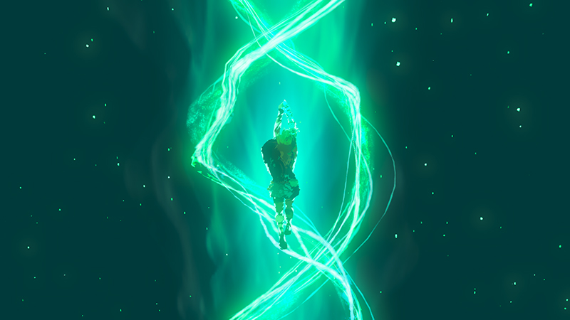 後半:『ゼルダの伝説 ブレス オブ ザ ワイルド』の戦闘シーンです。敵がビームをチャージするときのリング状エフェクトにより、お客様は攻撃の予兆を知ることができます。ビーム自体や着弾表現もエフェクトです。剣で敵を斬ったときのヒットエフェクトは、実際には存在しない「手応え」をデザインして表現しています。