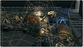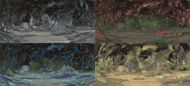 - ・ このモデルの形状に基づいて、岩壁の凹凸形成、鍾乳石モデルの配置、質感の割り当てなど、プロシージャル手法を用いて自動で装飾しています。