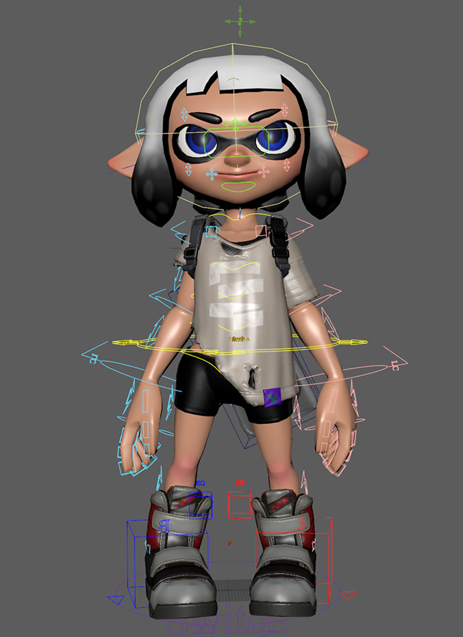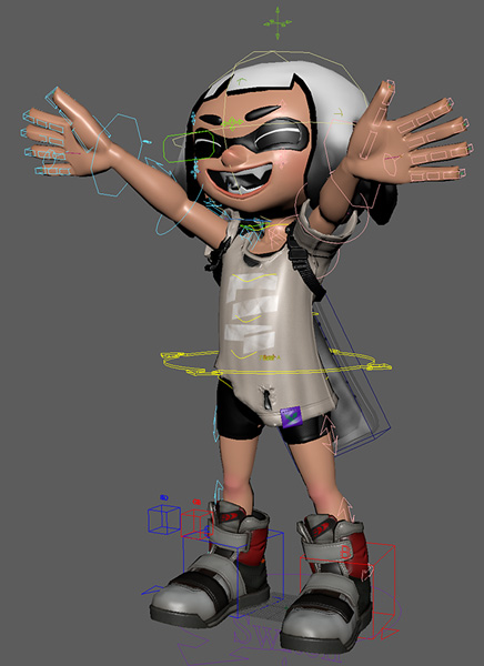 - ・ 画像の、「インクリング」というキャラクターの周りにある矢印やラインなどが「リグ」であり、この仕組みの開発や取り付けを行います。