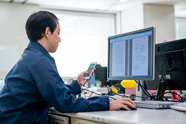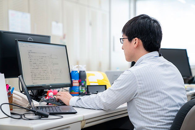 また、特許権などの知的財産権は他者が所有するものも多数存在しており、他者の権利を侵害しないための業務も重要です。知的財産部では、開発中製品の仕様を、開発の初期段階で把握し、関連する他者の権利が存在するかについて調査し、開発中製品の仕様と他者の権利との関係を検討したり、先行技術の調査をおこなって他者の権利の有効性についても検討したうえで、開発者にアドバイスを行っています。