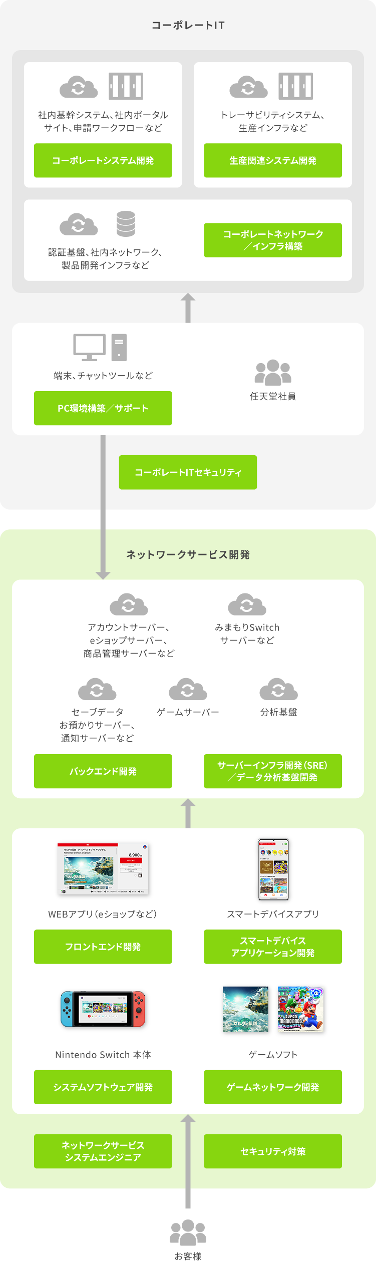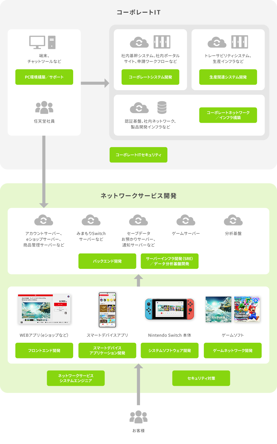 理工系(ネットワーク)には、主にお客様向けのサービス・システムの開発・運用を行う「ネットワークサービス開発」と、主に社内向けのサービス・システムの開発・運用を行う「コーポレートIT」の2種類が存在します。どちらも、Webやネットワークに関するIT技術を活用して業務を行うという点で共通しており、さまざまな業務領域で協働することがあります。業務概要図を通して、各業務の関係性や業務の内容をご説明します。