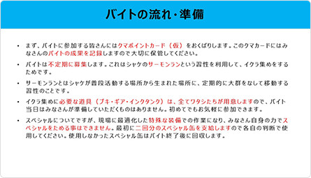 この新しい協力モードは、「サーモンラン」という名称にしました。ただ、1作目でおなじみになった「ナワバリバトル」とはまったく異なるゲームです。ですから、いきなり遊んでくださいと言っても、お客さんにはすぐに共感されないだろうと思っていました。しかも、「サーモンラン」はいろいろと実験をしながら作っていたのですが、最終的にどのようなかたちにすればいいのか、スタッフたちにもよく理解されていなかったのです。そこで私は、コンセプトを明確にするために、「バイトマニュアル」という企画書を書くことにしました。『スプラトゥーン2』というゲームのなかで、「サーモンラン」を1本筋が通ったモードにするために、複数人での協力プレイを、アルバイトに見立てることにしたのです。その「バイトマニュアル」を元に、映像も作成し、お客様が遊ぶ前に見ていただくことで、スムーズに「サーモンラン」の世界に入っていただけるようにしようと思ったのです。