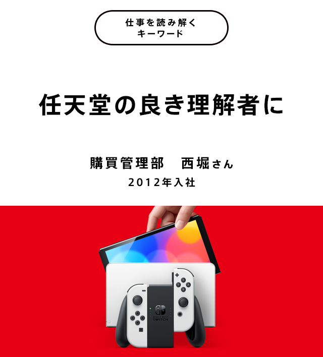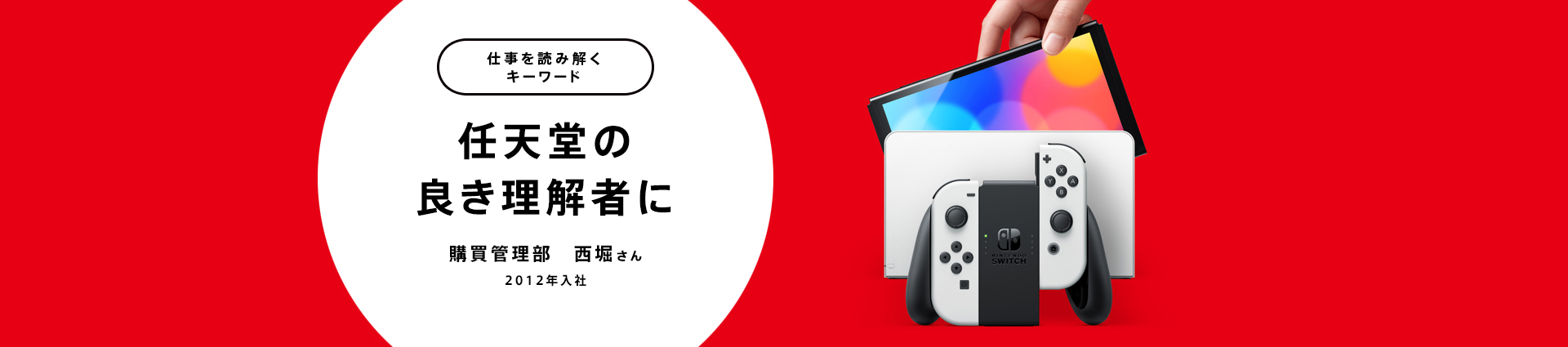 任天堂は、ゲーム専用機や周辺機器等の製品については自社で生産工場を持たない「ファブレス型」の生産体制を取っています。ゲーム機を製造するためには、数多くの取引先から、さまざまな部品を提供していただく必要があります。そのため取引先の皆さんに任天堂の良き理解者となって、協力していただけるような関係づくりがとても大事になります。このような関係づくりも、まずは現場の担当者から始まりますので、購買の担当者の責任は大きいですが、とてもやりがいのある仕事だと感じています。