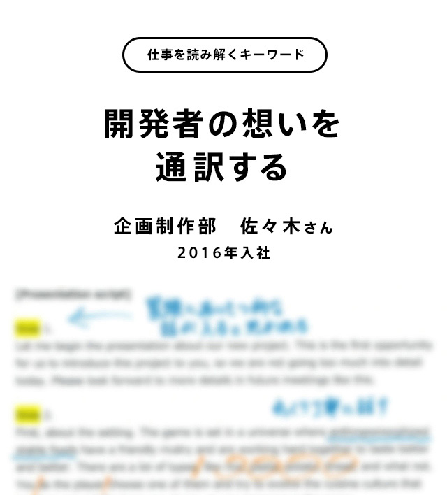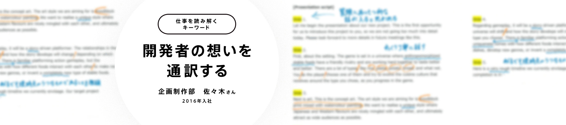 通訳コーディネートの仕事では、本社と海外子会社との重要なミーティングに同席することもあれば、メディアによるゲーム開発者インタビューに帯同するほか、取引先とのミーティングの通訳を担当することもあります。また、海外の開発会社と協力して行うゲーム開発においては、企画段階から完成するまで、プロジェクトの一員として参加するなど、さまざまなケースがありました。そんななか、私が現在関わっている通訳の仕事は、ちょっと特殊な例になるのかもしれません。
