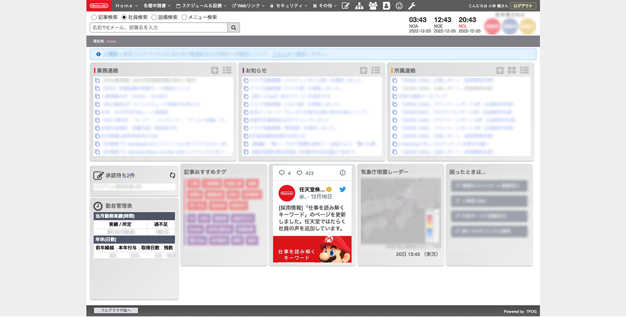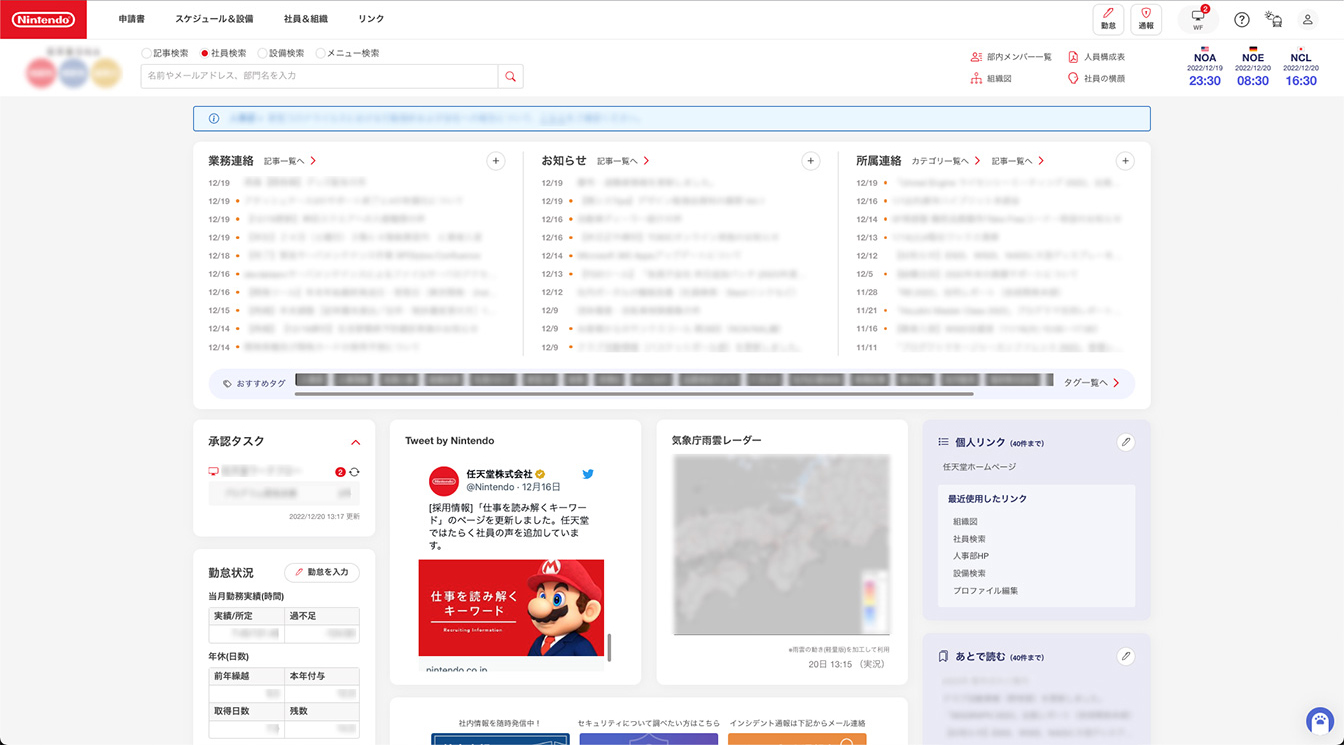 任天堂には、社員だけが閲覧することができる社内ポータルサイトがあります。このポータルは、社員が社内の情報にアクセスする際の入り口になっており、全社員が一日一度は訪れるような重要なサイトです。ポータルでは、社内に共有すべき情報である「お知らせ」が随時投稿されるほか、帰宅・外出するときに役立つような「雨雲レーダー」をチェックできたり、任天堂がお客様に発信している情報を把握してもらうために「任天堂公式ツイッター」の画面を表示させたり、さまざまなコンテンツが閲覧できるようになっています。