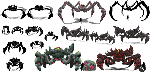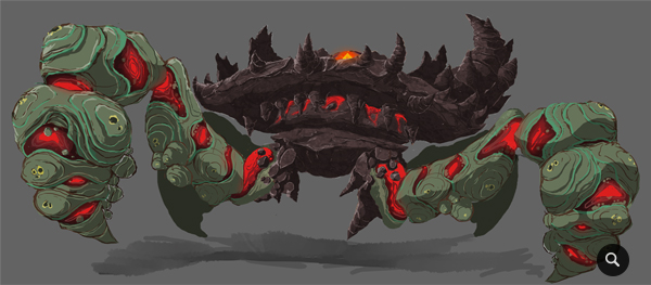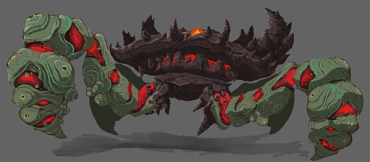 また、主人公のリンクは「トーレルーフ」という天井をすり抜けられる能力を持っています。その能力を活かすために、プレイヤーが乗ることのできる平らな足場のような形状を胴体にあたる部位にデザインしました。胴体の上に乗ったプレイヤーが目玉に到達できるよう、あえて、ボルドゴーマのモチーフである甲殻類の特徴から外れた形状を取り入れています。それ以外にもさまざまな部分で、実際に遊んでは修正するということを繰り返しながら細部を詰めていき、最終的にボルドゴーマを完成させることができました。このように、作ったキャラクターを実際に遊び、その都度プレイヤーの体験をイメージしながら、ブラッシュアップを続けて完成させていくことが重要だと実感しています。