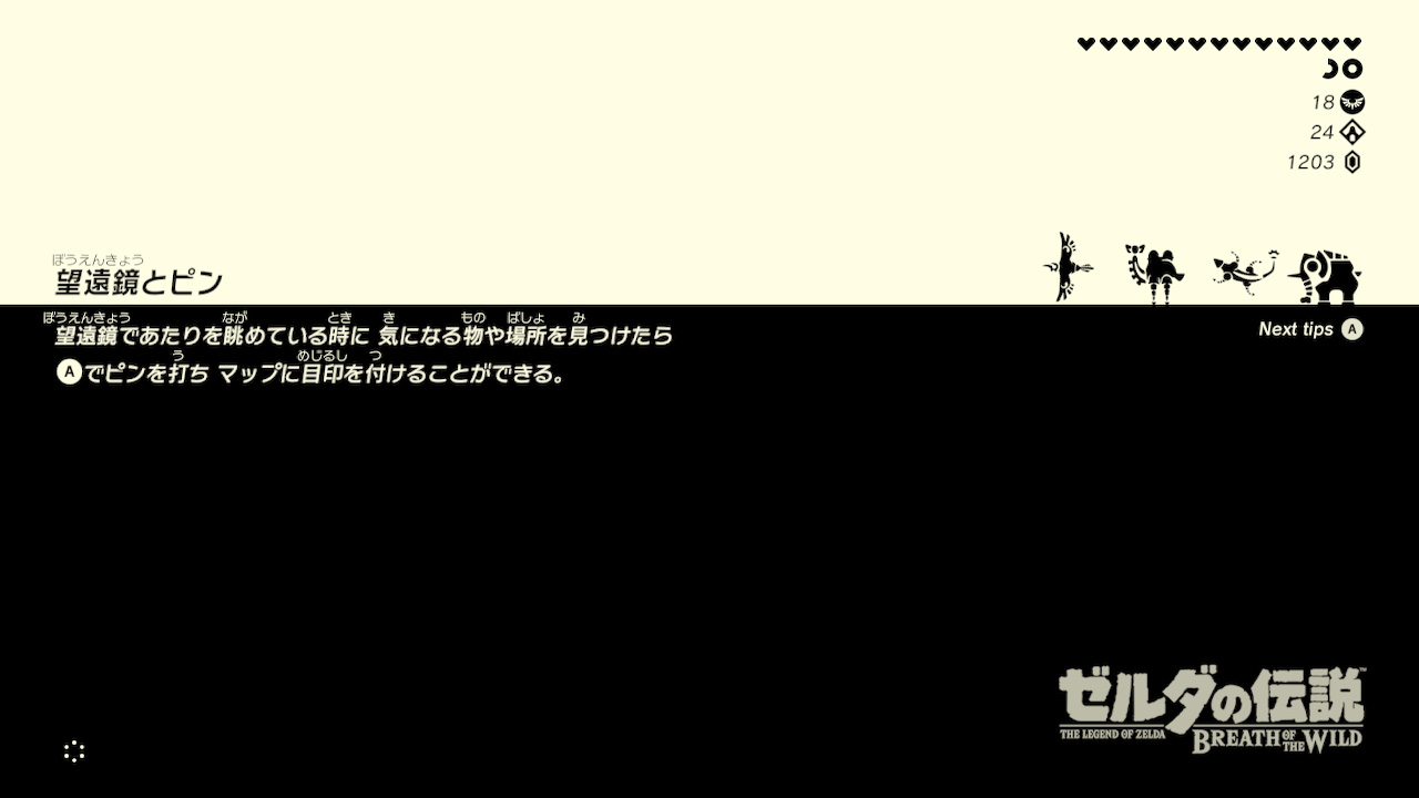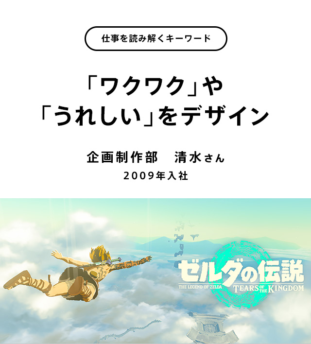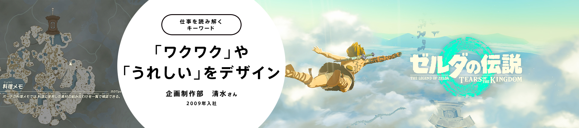 両タイトルの共通点として、広大なフィールドを冒険するリンクがワープする際、新しい地形に切り替えるためのロード時間が発生します。『ゼルダの伝説 ブレス オブ ザ ワイルド』のロード画面では、待ち時間を実用的な時間に変えるため、冒険の役に立つヒント(Tips)を表示するようにしていました。その後『ティアーズ オブ ザ キングダム』の開発では、続編でありながら新しさをどのように出すのか悩みました。そこで、「より深く没入できる」をテーマに何かできることはないか?と検討した結果、必要になったのは、自分たちの日常生活で感じる「嬉しい体験」でした。