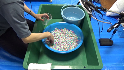 水とスライムをベースに、発泡ビーズ、ペレット、スパンコール、ガラスビーズなど、さまざまな素材を試す中で、ようやく「これだ!」と思えたのがアイロンビーズです。手の動かし方や使う道具も工夫したことで、イメージしていた音にたどり着くことができました。これまで収録した音を聞いてくれていたメンバーからも「良くなった!」と言われ、試行錯誤した日々を思い出してうれしくなりました。壁にぶつかるたびに周りのメンバーがアドバイスをくれ、実験の様子を見ては「応援してるよ」と声をかけてくれるなど、みんなの支えがなければ決して完成できなかったと思います。