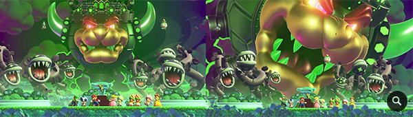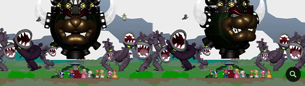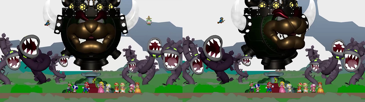 「平面カメラ」でどう演出すればよいのかを考え続けていたある日、ふと帰り道に空を見上げると、飛行機が飛んでいるのが目に入りました。その時、「離れて見るから小さいけれど実際はすごく大きいはず……」と思い、同時に「これだ!」とひらめきました。「城クッパも最初は小さくしておき、通過時に画面いっぱいに大きくすれば迫力が出せる」と考え、早速チームに提案したところ、好感触を得ることができました。
