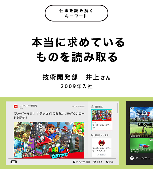 Nintendo Switchを起動させると、トップ画面の下に6つのアイコンが表示されます。そのいちばん左にあるのが「ゲームニュース」で、このアイコンを選ぶと、任天堂から配信される、さまざまなゲームの最新情報を得られるようになっています。Wiiの「みんなのニンテンドーチャンネル」やニンテンドー3DSの「いつの間に通信」などの開発や運用に関わってきた私は、Nintendo Switchの発売と同時にサービスがスタートする「ゲームニュース」のシステム開発に携わることになりました。