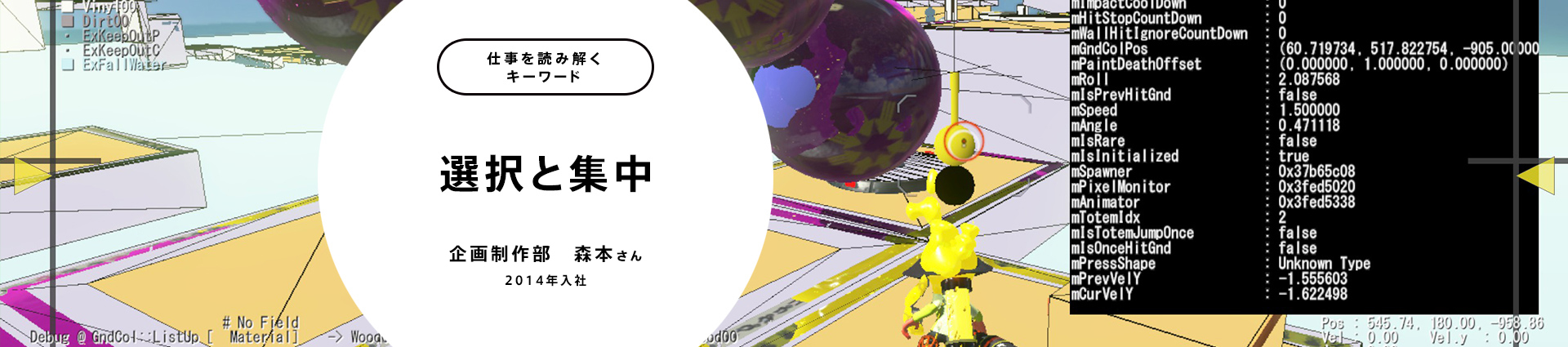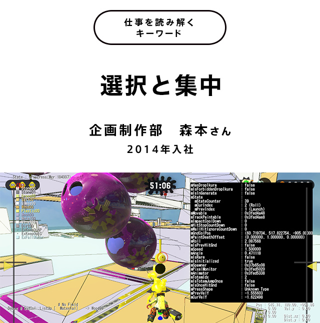 その地形ギミックのシステムは、『スプラトゥーン2』の発売後にも役に立ちました。このゲームでは「フェス」という、お題をもとにチームに分かれて勝敗を決める期間限定のイベントが行われているのですが、新しい地形ギミックが早く作れるようになったことで、月に1回のペースでフェス専用のギミックを持った地形(ミステリーゾーン)を配信できるようになったのです。その結果、長く遊んでいただけるタイトルにもなったと思いますし、作る側としても、大勢の方々からの反応をすぐに次の配信で活かすことができるようになったので、このシステムを作ってよかったと思っています。今回は、開発期間が短いということもあって、地形ギミックに集中して取り組みましたが、次の機会では、他の部分にも広げられればいいなと思っています。