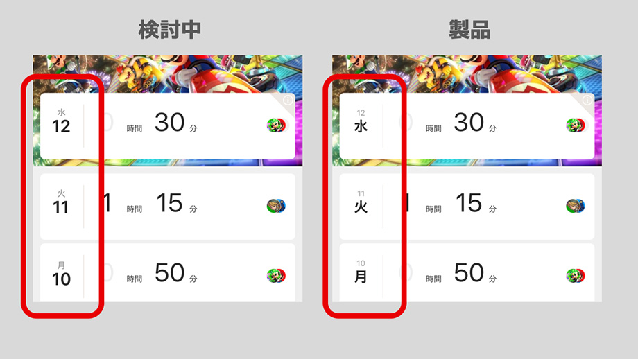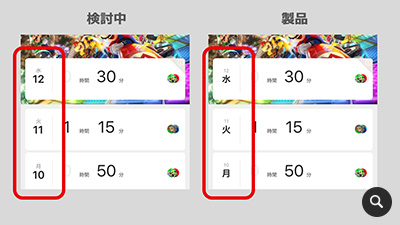 一例ですが、検討中の画面では、日付を大きく表示しています。ですが、製品版では曜日を大きく表示しています。これは、学校の時間割を想像してもらうとわかりやすいと思いますが、「今日、塾じゃないの?」や「土曜だから、OK!」など親子間では曜日で会話が行われていますよね。このようにスムーズに会話しやすくするため、曜日を選んで表示しています。
