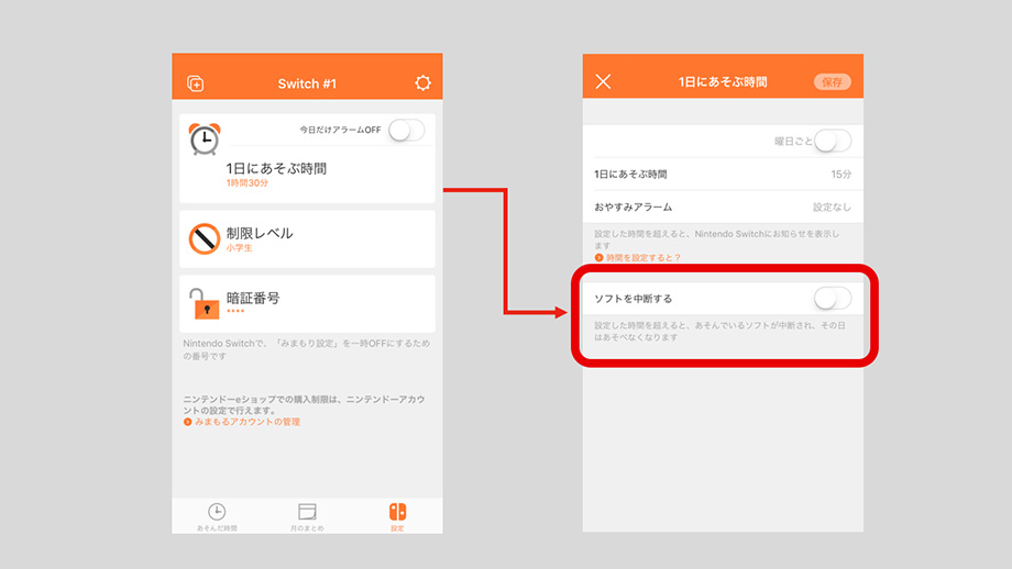 また、『みまもり Switch』には保護者によって設定できる「ゲームのやめどきの案内方法」が、2つあります。