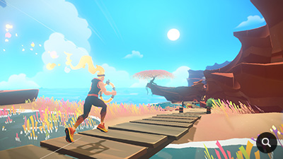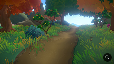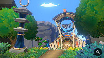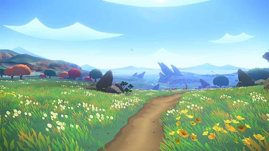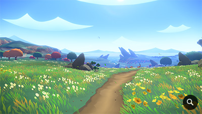 はじめに作ったスタート地点は、岩に囲まれた入江のような場所にしたのですが、最初に遊ぶ地形としては印象が薄いように感じましたし、プレイヤーにはまず、冒険する世界が広いことを感じていただくのが大切だと思いました。そこで開放感のある魅力的な空間に見せるにはどうしたらいいのか考えた結果、スタート地点は閉鎖的な森林からはじまり、しばらく進むと開けた空間が広がる設計にすることで、広大な平野を際立たせることができました。