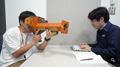 このゲームの特徴は、段ボールでVRゴーグルを組み立て、それを覗くと視界の360度がゲームの世界になるVR(バーチャルリアリティ)が楽しめるようになるところにあります。段ボールで組み立てるToy-Conにはいろんな種類があり、私はそのなかのバズーカを使った「対戦!カバズーカ」というミニゲームのサウンドを担当することになりました。