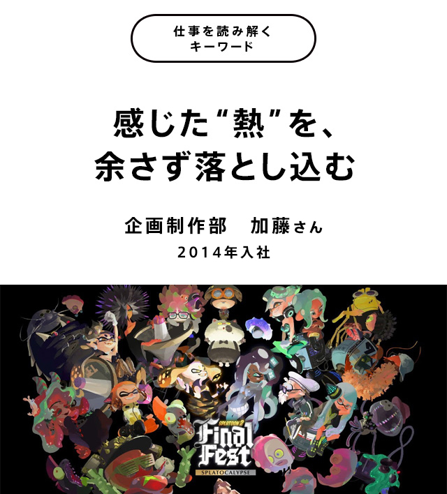 尖ったステージをお客様に届ける取り組みはNintendo Switch用ソフトの『スプラトゥーン2』の開発でディレクターに提案し、実現に至りました。このゲームでは「フェス」と呼ばれる1日から2日間の期間限定イベントが行われていました。フェスでは「マヨネーズとケチャップのどちらが好きか?」というようなお題が2択で出され、プレイヤーはそれぞれ選んだ陣営に入ってバトルをします。これまで製品に組み込むことが難しかったステージは、このフェスの期間にのみ遊べる対戦ステージ「ミステリーゾーン」として採用され、お客様に楽しんでいただけるようになったのです。