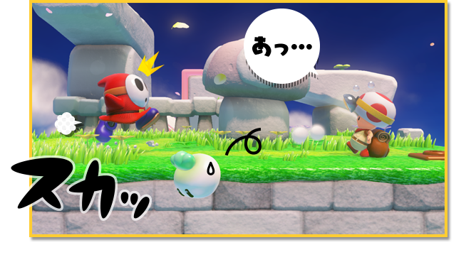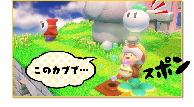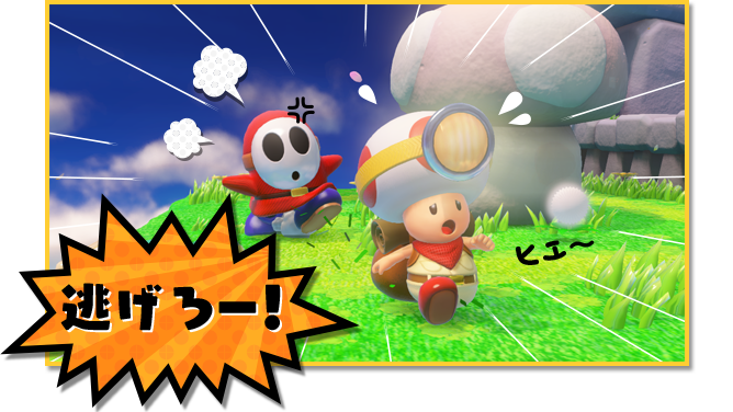 キノピオ隊長のリュックは、実は超重たい!だからキノピオ隊長はジャンプができないよ。そのかわり、カブを抜いて投げたり、トロッコにのったり、カベをほったり、さまざまなアクションを使って、進め!キノピオ隊長!