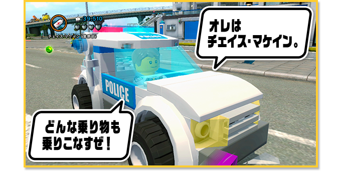チェイス・マケインは運転の達人。パトカーはもちろん、消防車にスポーツカー、作業車に馬まで、さまざまな乗り物を自由に乗りこなすことができるんだ。