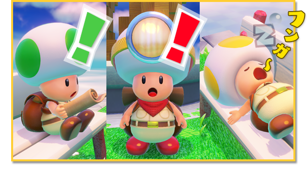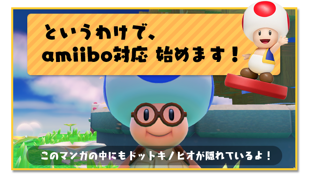 Wii Uソフト『進め!キノピオ隊長』がamiiboに対応。キノピオのamiiboをタッチすると、ステージのどこかに登場するドットのキノピオと「かくれんぼ」が楽しめるよ!ドットのキノピオを見つけたらWii U GamePadをタッチしよう!
