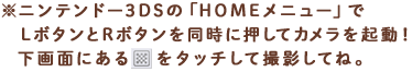 ※ニンテンドー3DSの「HOMEメニュー」で LボタンとRボタンを同時に押してカメラを起動!下画面にあるQRコードをタッチして撮影してね。