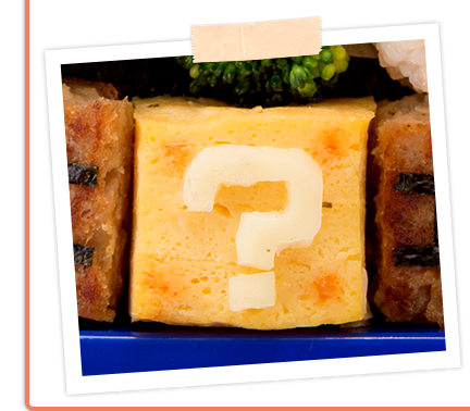 1. 1 たまご焼きを作って正方形に切り、トマトケチャップで4つの角に点をつけます。