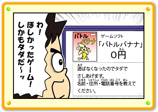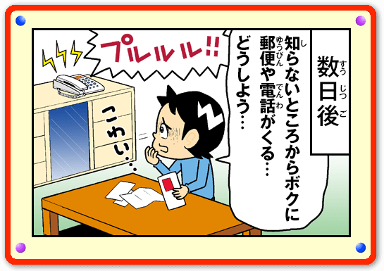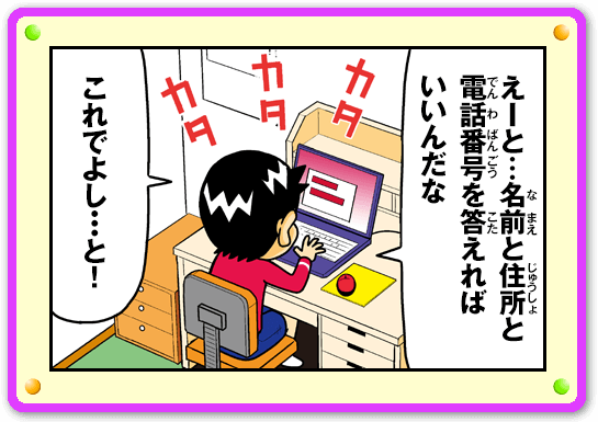 インターネットには、個人情報を集めてよくないことに使おうとするわるい人もいます。Miiverseや掲示板には個人情報を書きこまないようにしましょう。わるい人に個人情報を見られると、この男の子のような目にあうかもしれません。Miiverseでは個人情報の書きこみを見つけたときに、その書きこみを消していますが、すぐに消されるわけではありません。ぜったいに個人情報を書きこむのはやめましょう!