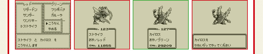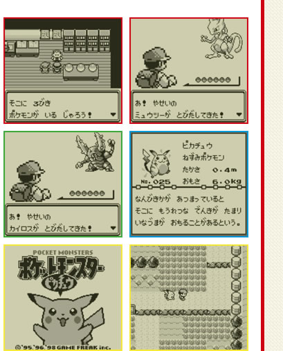 ※画像は、赤枠:『ポケットモンスター  赤』/緑枠:『ポケットモンスター  緑』/⻘枠:『ポケットモンスター  ⻘』/⻩枠:『ポケットモンスター  ピカチュウ』(すべて開発中のものです。)