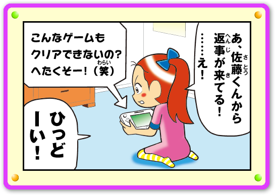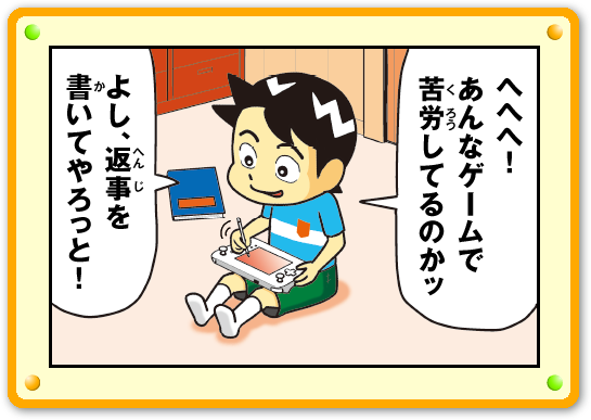 Miiverseやそのほかのインターネット掲示板では、相手の顔が見えないため、軽い気持ちで悪口を書いたり、らんぼうな言葉づかいをしてしまいがちです。ふざけて書いたつもりでも、相手はあなたが本心で書いたのだと思い、いやな気持ちになってしまうかもしれません。書きこむときは、それを見た相手がどう思うかをよく考えましょう。