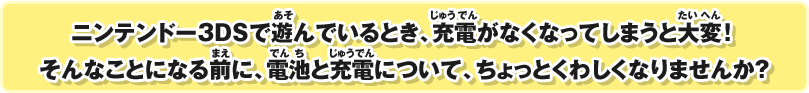 ニンテンドー3DSで遊んでいるとき、充電がなくなってしまうと大変!そんなことになる前に、電池と充電について、ちょっとくわしくなりませんか?