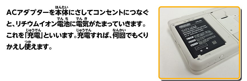 ACアダプターを本体にさしてコンセントにつなぐと、リチウムイオン電池に電気がたまっていきます。これを「充電」といいます。充電すれば、何回でもくりかえし使えます。