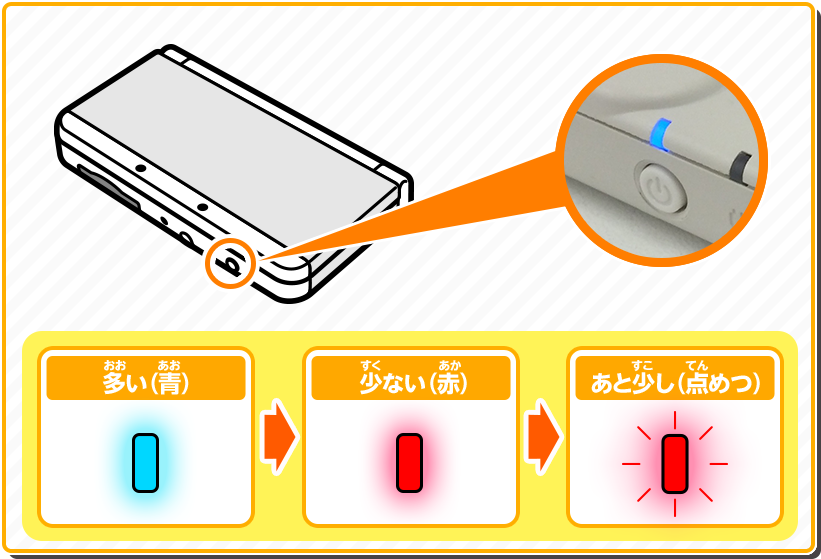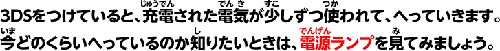 3DSをつけていると、充電された電気が少しずつ使われて、へっていきます。今どのくらいへっているのか知りたいときは、電源ランプを見てみましょう。