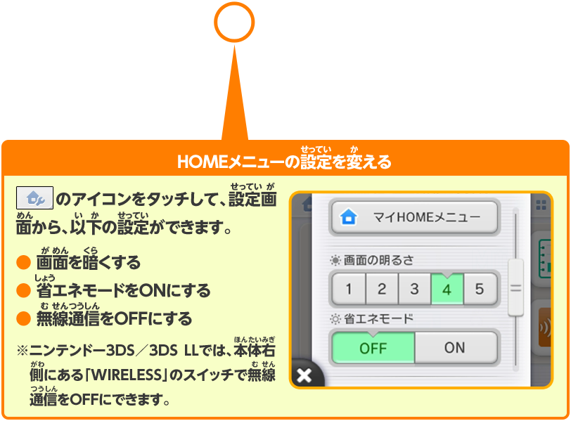 HOMEメニューの設定を変える HOMEメニュー左上のアイコンをタッチして、設定画面から、以下の設定ができます。 ・画面を暗くする ・省エネモードをONにする ・無線通信をOFFにする ※ニンテンドー3DS/3DS LLでは、本体右側にある「WIRELESS」のスイッチで無線通信をOFFにできます。