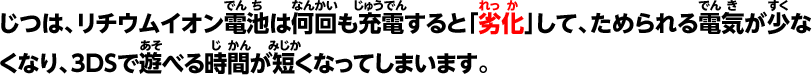 じつは、リチウムイオン電池は何回も充電すると「劣化」して、ためられる電気が少なくなり、3DSで遊べる時間が短くなってしまいます。