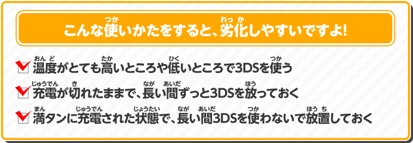 こんな使いかたをすると、劣化しやすいですよ!・温度がとても高いところや低いところで3DSを使う・充電が切れたままで、長い間ずっと3DSを放っておく・満タンに充電された状態で、長い間3DSを使わないで放置しておく
