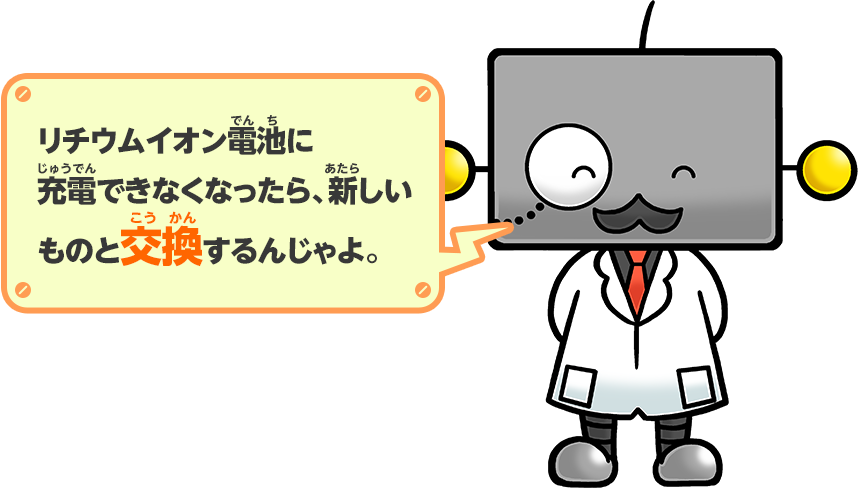 リチウムイオン電池に充電できなくなったら、新しいものと交換するんじゃよ。