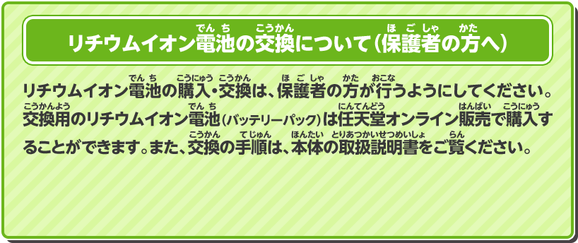 リチウムイオン電池の購入・交換は、保護者の方が行うようにしてください。 交換用のリチウムイオン電池(バッテリーパック)は任天堂オンライン販売で購入することができます。また、交換の手順は、本体の取扱説明書をご覧ください。 任天堂オンライン販売