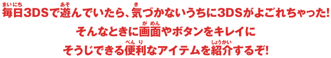 毎日3DSで遊んでいたら、気づかないうちに3DSがよごれちゃった!そんなときに画面やボタンをキレイにそうじできる便利なアイテムを紹介するぞ!