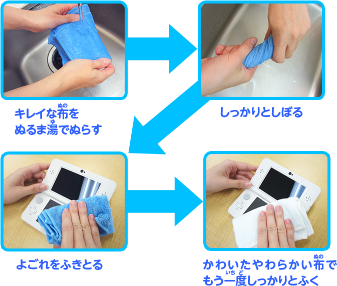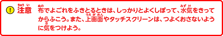 注意:布でよごれをふきとるときは、しっかりとよくしぼって、水気をきってからふこう。また、上画面やタッチスクリーンは、つよくおさないように気をつけよう。