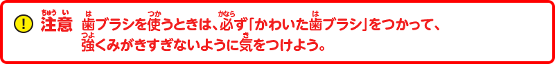 注意:歯ブラシを使うときは、必ず「かわいた歯ブラシ」をつかって、強くみがきすぎないように気をつけよう。