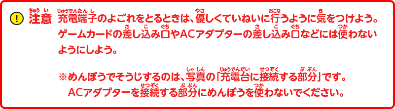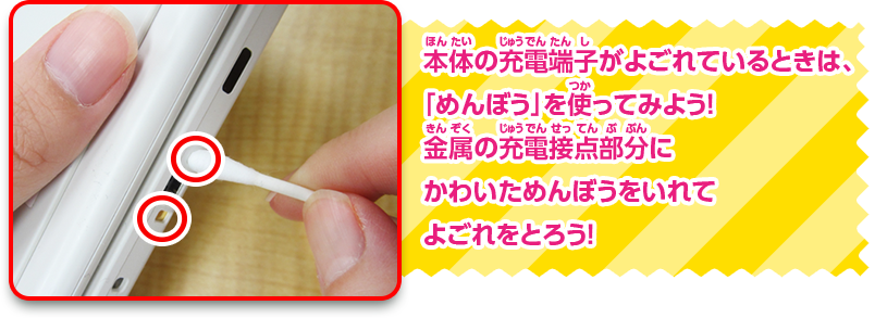 注意:充電端子のよごれをとるときは、優しくていねいに行うように気をつけよう。ゲームカードの差し込み口やACアダプターの差し込み口などには使わないようにしよう。※めんぼうでそうじするのは、写真の「充電台に接続する部分」です。ACアダプタを接続する部分にめんぼうを使わないでください。