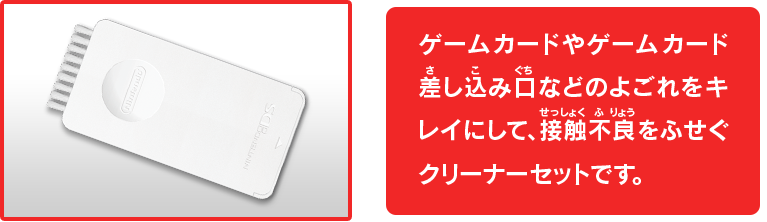 ゲームカードやゲームカード差し込み口などのよごれをキレイにして、接触不良をふせぐクリーナーセットです。