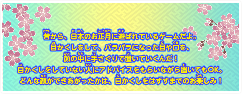 昔から、日本のお正月に遊ばれているゲームだよ。目かくしをして、バラバラになった目や口を、顔の中に手さぐりで置いていくんだ!目かくしをしていない人にアドバイスをもらいながら置いてもOK。どんな顔ができあがったかは、目かくしをはずすまでのお楽しみ!